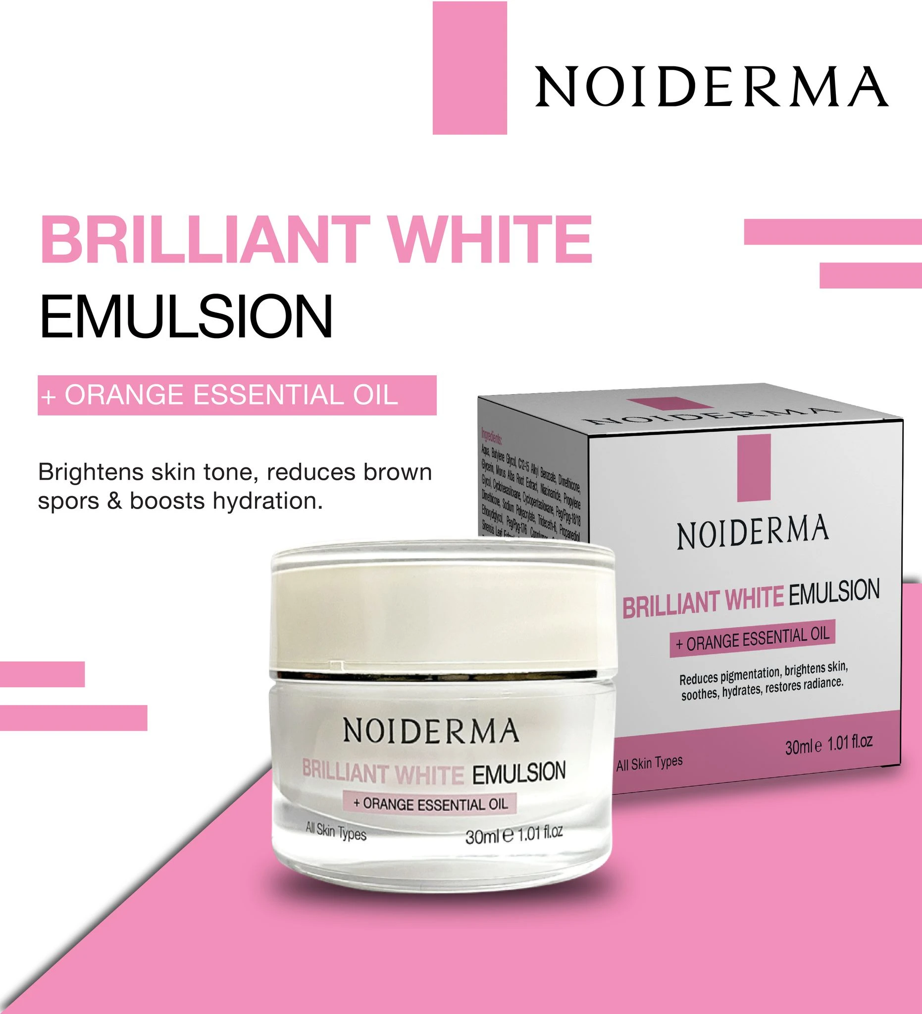 Noiderma Brilliant White Emulsion is a lightweight, fast-absorbing moisturizer that helps brighten skin tone, improve texture, and provide long-lasting hydration.